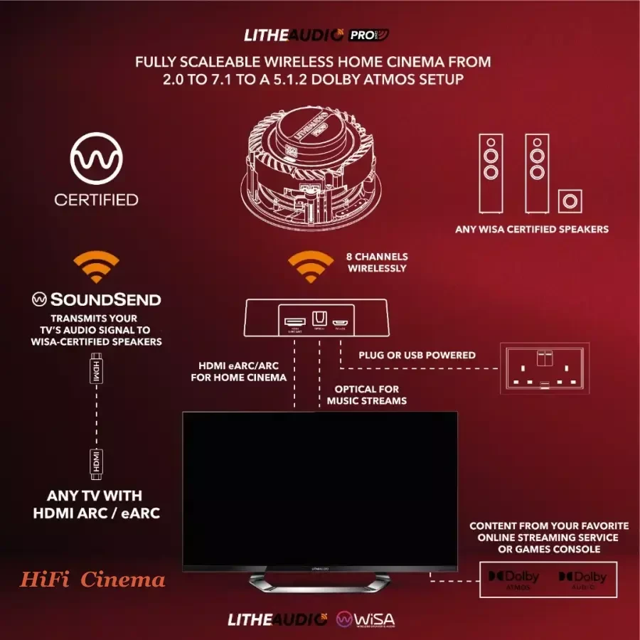 Lithe Audio WiSA SoundSend під'єднується до телевізора через порт HDMI з функцією ARC (поворотного аудіоканалу) або eARC (поліпшеного поворотного аудіоканалу) для приймання звуку, а потім передає цей звуковий сигнал бездротовою мережею на стельові динаміки серії Lithe Pro, на які встановлено модуль Lithe Audio WiSA Bolt-on (SKU: 06501), або будь-які інші динаміки, сертифіковані стандартом WiSA. Передавач Lithe Audio WiSA SoundSend - відмінне рішення для повноцінної реалізації формату Dolby Atmos в домашньому кінотеатрі.